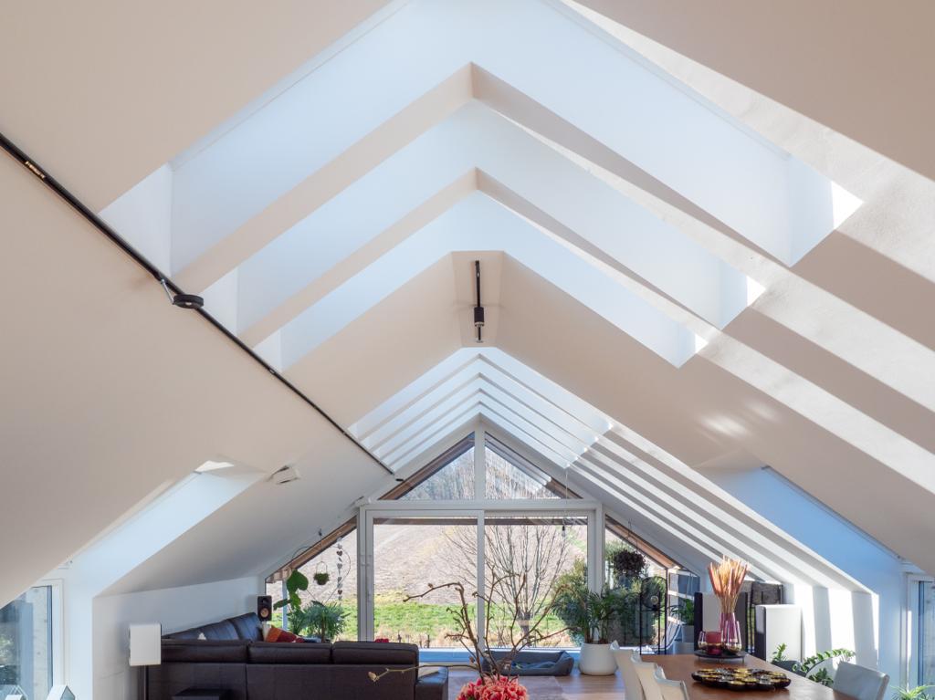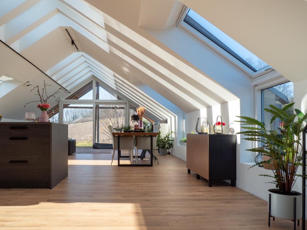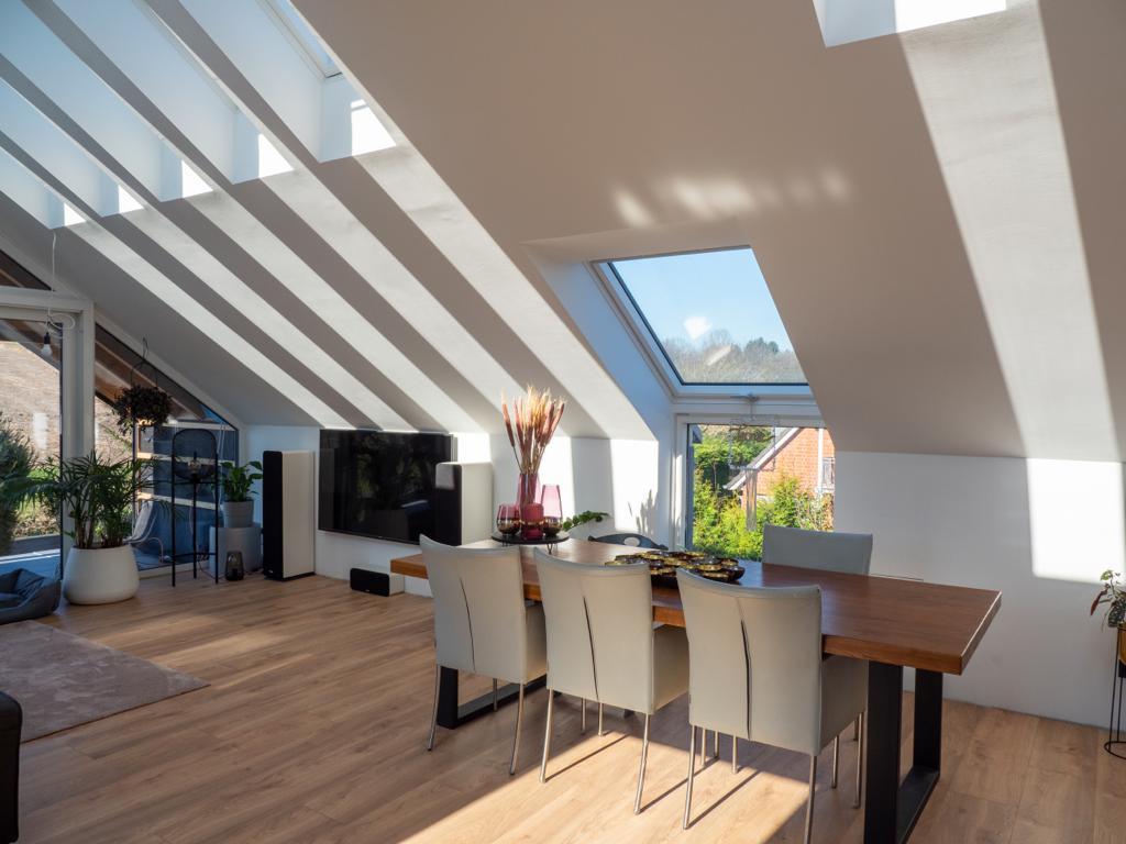 Diese Komplettsanierung einer Wohnung in Frechen transformierte das Dachgeschoss in ein modernes, lichtdurchflutetes Zuhause. Der offene Wohnbereich beeindruckt durch die freigelegte, weiß gehaltene Dachkonstruktion und die großzügigen Fensterflächen, die für eine außergewöhnliche Helligkeit sorgen. Ein durchgängiger, warmer Holzboden und dunkle, elegante Möbelakzente, wie in der Küche und im Essbereich, schaffen ein harmonisches und stilvolles Ambiente, das den Blick in die Natur freigibt.
