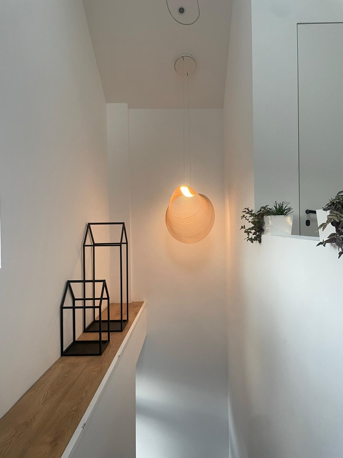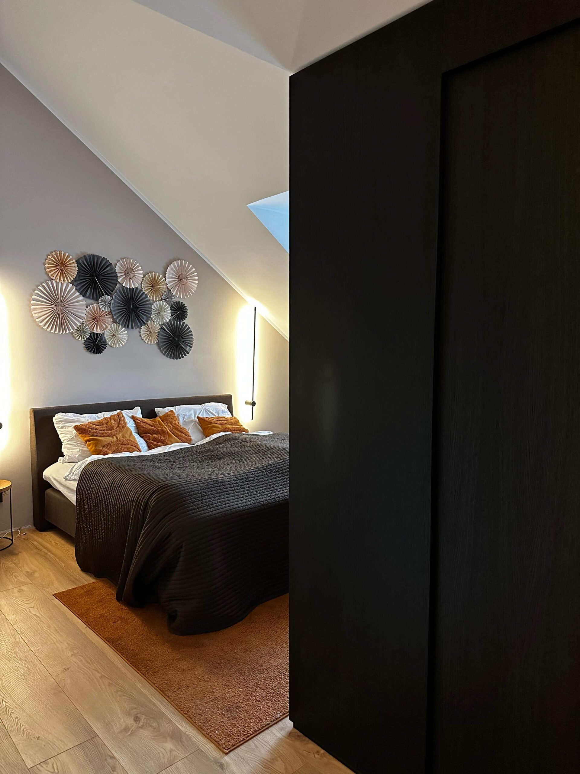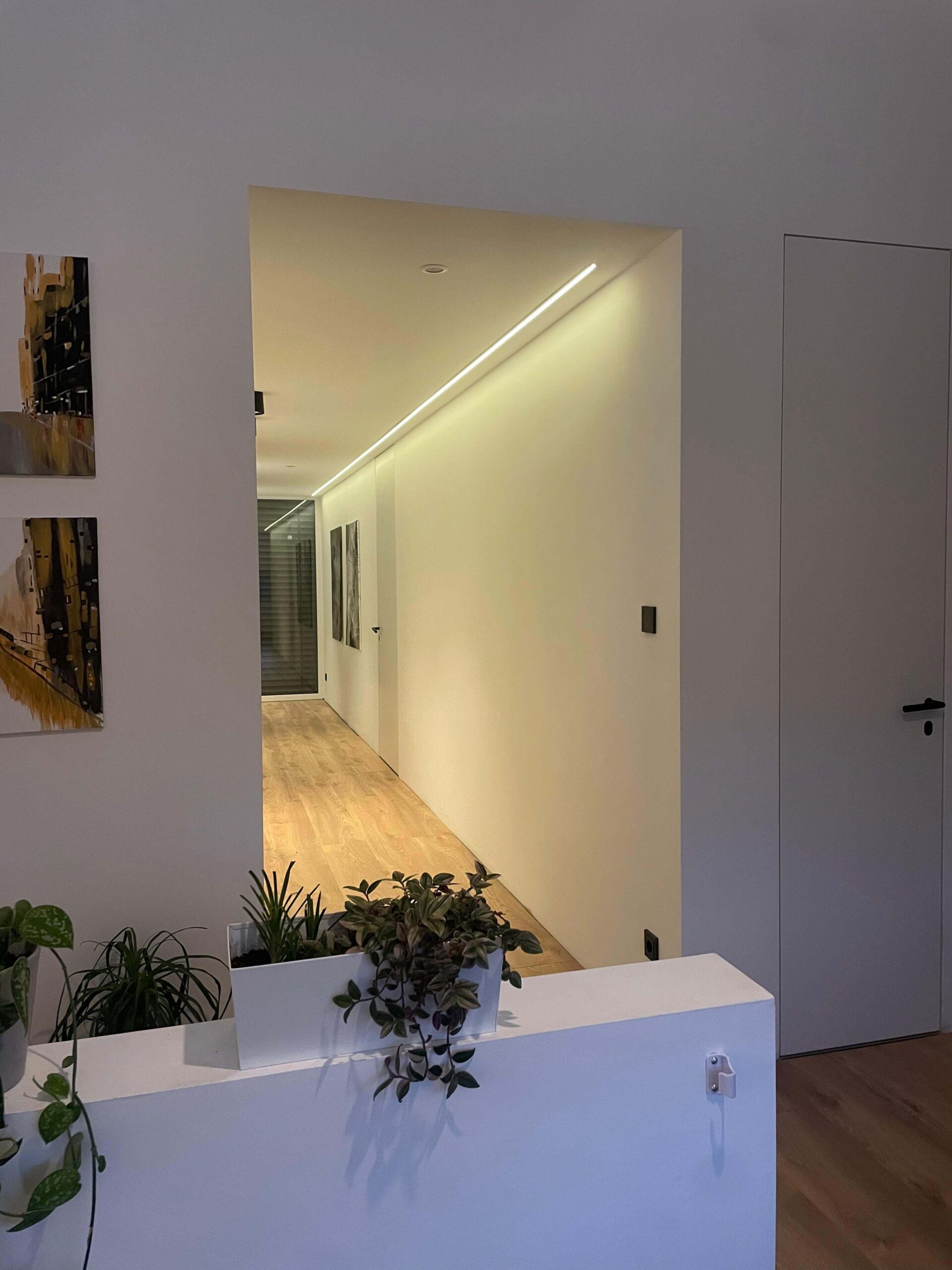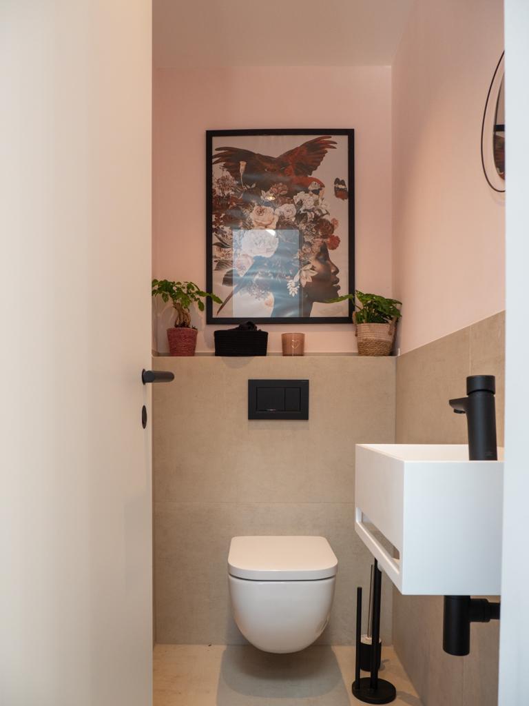 Das durchdachte Design zieht sich konsequent durch die gesamte Wohnung. Im Schlafzimmer sorgen warme Erdtöne und indirekte Beleuchtung für Gemütlichkeit. Funktionale Bereiche wie der Flur werden durch minimalistische Gestaltung und eine moderne, lineare Lichtführung aufgewertet. Selbst das Gäste-WC besticht durch die stilvolle Kombination aus beigefarbenen Fliesen, zartem Rosa und modernen, dunklen Sanitärelementen. Das Ergebnis ist eine rundum gelungene und hochwertige Sanierung, die zeitgemäßen Wohnkomfort mit einem architektonisch reizvollen Design vereint.